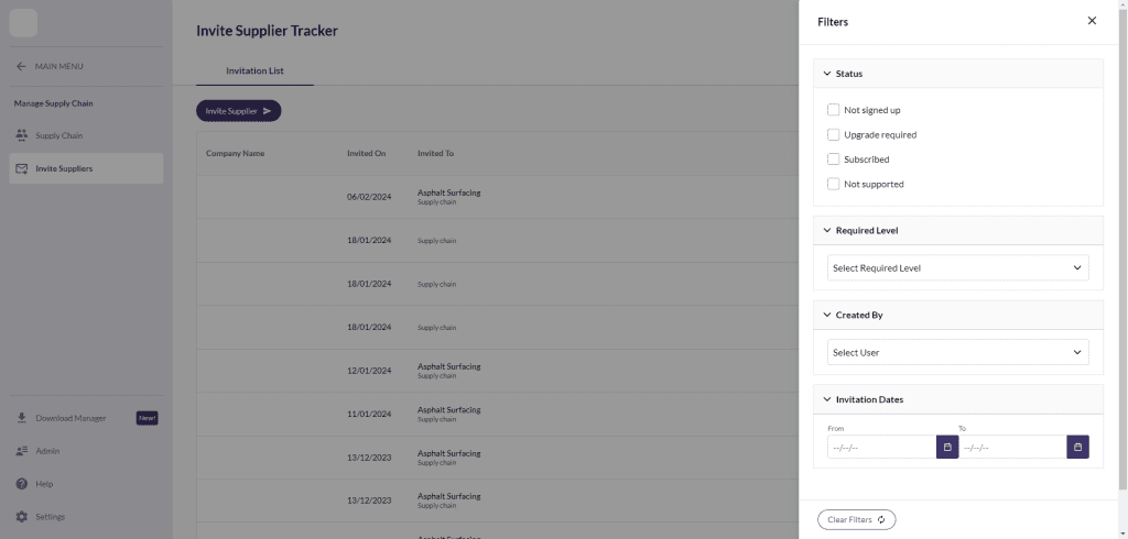 The ‘Invited To’ column will display the name of the segment, as well as where in the platform the invite came from. This could be in Supply Chain or Projects.